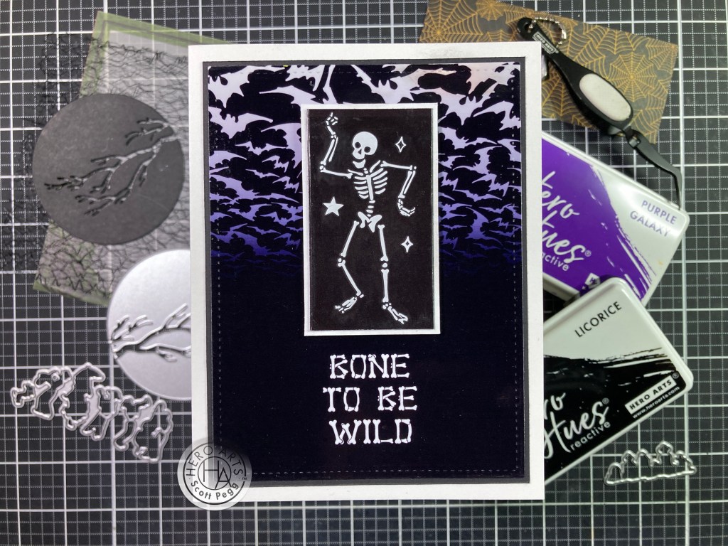 I went ahead and fussy-cut the white border from the mushrooms – a little tedious, but worth it! I arranged those with two rocks, the medium groundcover and two leaves into this pleasing arrangement. I masked off a 2.25″ x 3.5″ area in the center of an A2 White card panel and ink blended Green Apple, Lemon Drop and Splash Reactive inks for a nice ombre background. I die-cut that panel with a 2.75″ x 4″ LFSRdie and added a thin black mat behind before gluing that to the front of an A2 White card base.