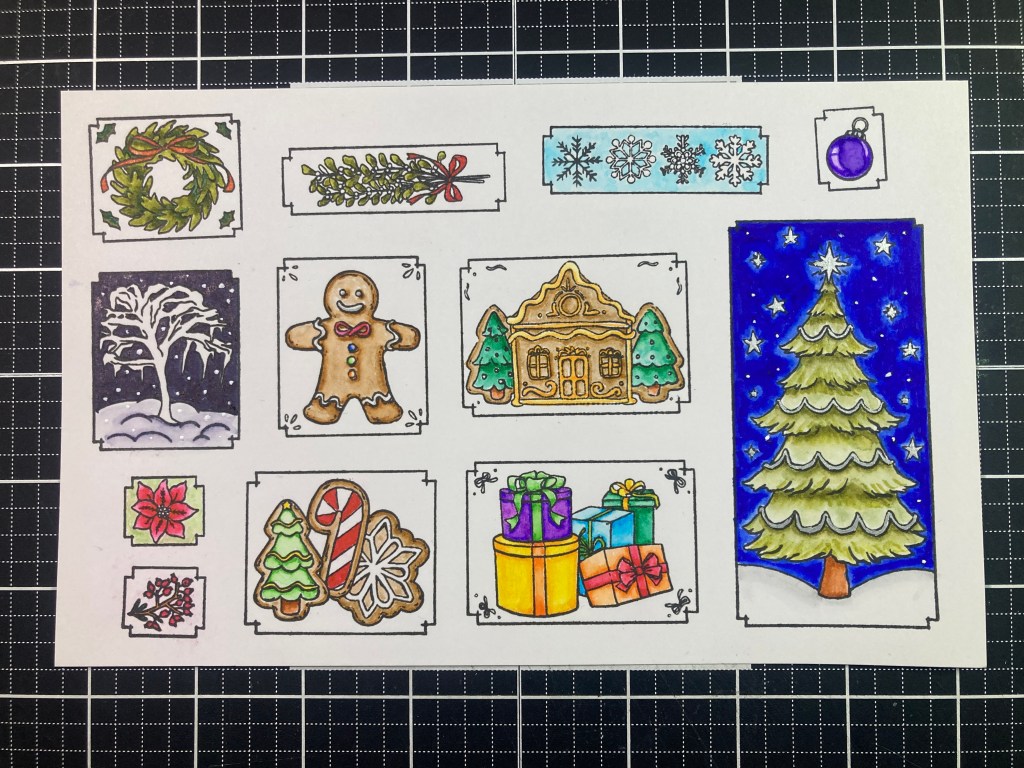 I was looking forward to coloring theses stamps so I began by stamping all the stamps (with VersaMark Onyx Black ink) on some Bristol Smooth Card Stock to color with my Zig Clean Color Real Brush Markers, and stamped another batch on some Stonehenge White card stock for coloring with my colored pencils.