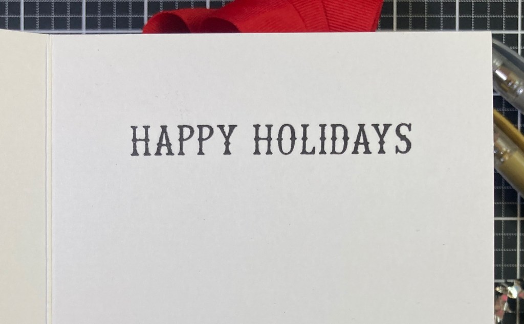 I trimmed the panel to 4″ x 5.25″ with my (NEW!) Tim Holtz Deckle Guillotine paper cutter (I do love a deckle edge) and lightly ink blended some Forest Moss Distress Oxide ink around the edges. I glued the printed and stenciled panel to a White A2 card base, and started gluing down the die cuts – the small Pothos leaf and the ends of the Fiddlefern dies are mounted with foam tape – as well as the butterfly! A few Clear Dots to highlight the sentiment and I used the HA Spring Enamel Dots (from the MMH April ’22 Kit) on the big leaves – there are actual drop shaped and oval dots in that pack. Finally I colored some tiny gems black (with an alcohol marker) to use as flower centers. And a lovely sentiment!